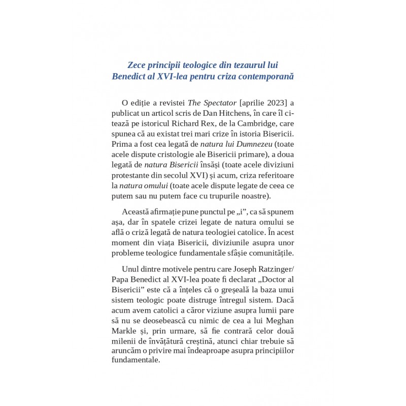 Unul dintre motivele pentru care Joseph Ratzinger/Papa Benedict al XVI-lea poate fi declarat “Doctor al Bisericii” este că a înţeles că o greşeală la baza unui sistem teologic poate distruge intregul sistem. Dacă acum avem catolici a căror viziune asupra lumii pare să nu se deosebească cu nimic de cea a lui Meghan Markle şi, prin urmare, să fie contrară celor două milenii de învăţătură creştină, atunci chiar trebuie să aruncăm o privire mai îndeaproape asupra principiilor fundamentale. În mijlocul acestei nopți întunecate din sufletul Bisericii, există cel puțin zece principii care pot fi extrase din tezaurul intelectual al lui Benedict al XVI-lea şi care ne pot ajuta să ne croim un drum prin criza actuală.