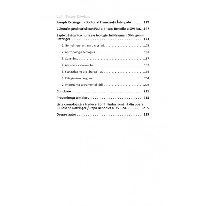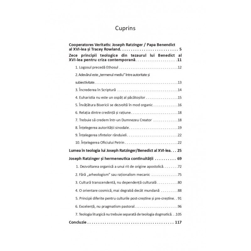 Volumul reuneşte şase studii în care Tracey Rowland interpretează coerent teologia lui Joseph Ratzinger ca expresie a unei “hermeneutici a continuității”, arătând cum credința, liturgia și cultura se dezvoltă organic în fidelitate faţă de Scriptură şi Tradiţie.