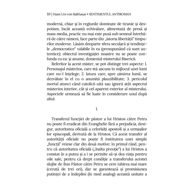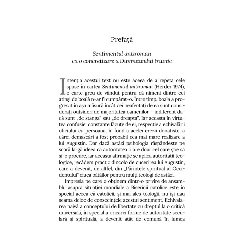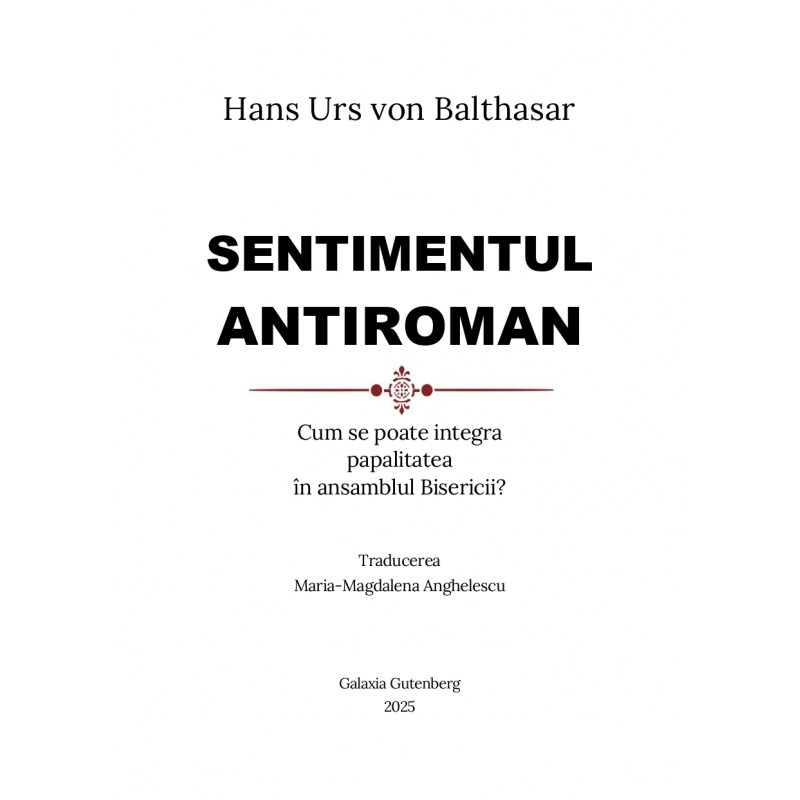 Cum poate fi integrată papalitatea într-o Biserică de o mare varietate confesională şi culturală? Această întrebare stă în centrul volumului Sentimentul antiroman, o lucrare de referinţă în teologia ecumenică contemporană. Pornind de la tensiunile istorice şi teologice care au alimentat suspiciunea faţă de Roma uneori manifestată ca un veritabil “sentiment antiroman” autorul explorează provocările și posibilităţile unei viziuni comune asupra primatului papal.